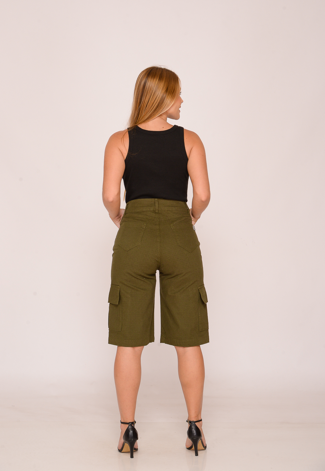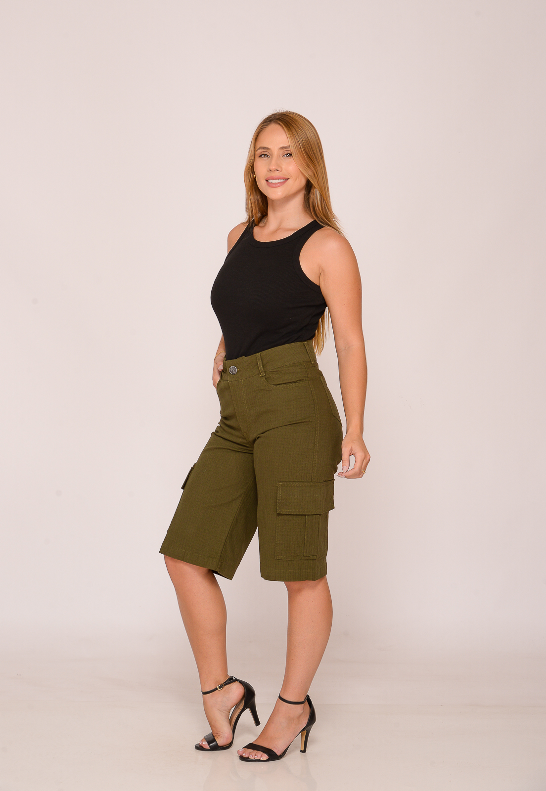 É a peça perfeita com composição casual e sofisticada. A bermuda é de cós, com bolsos frontais, traseiros, além dos bolsos cargos.