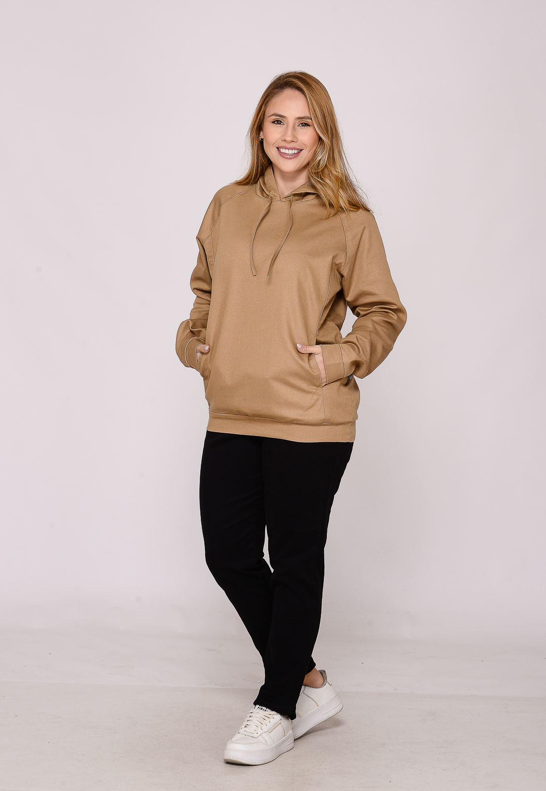 Com Capuz e bolso, o bolso canguru além de enfatizar o visual, oferece a praticidade de guardar objetos e aquecer as mãos.