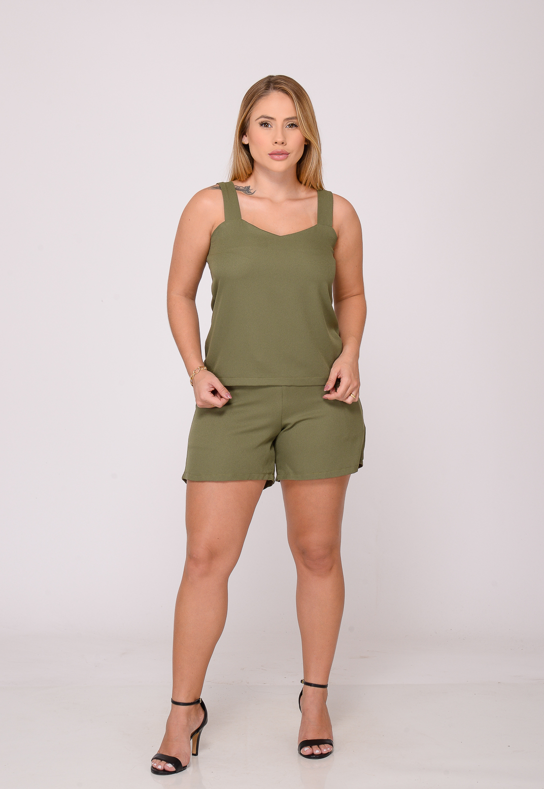 Conjunto feminino de crepe, composto de shorts com bolsos frontais, com elástico na cintura, blusa regata.