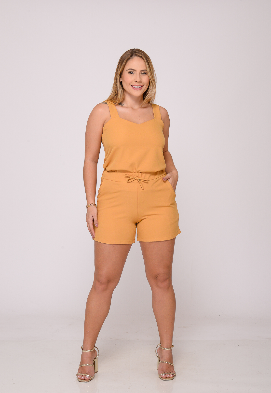 Conjunto feminino de crepe, composto de shorts com bolsos frontais, com elástico na cintura, blusa regata.